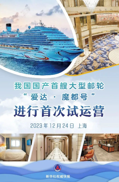 12月24日,國產(chǎn)首艘大型郵輪“愛達·魔都號”在上海吳淞口國際郵輪港離港出海,進行首次試運營。