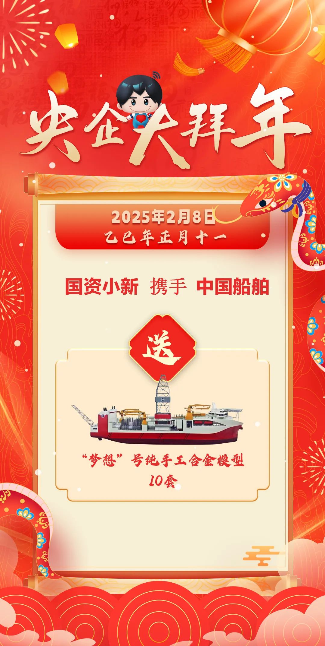 今天“國(guó)資小新”聯(lián)合中國(guó)船舶抽取10位幸運(yùn)粉絲,送上“夢(mèng)想”號(hào)純手工合金模型。