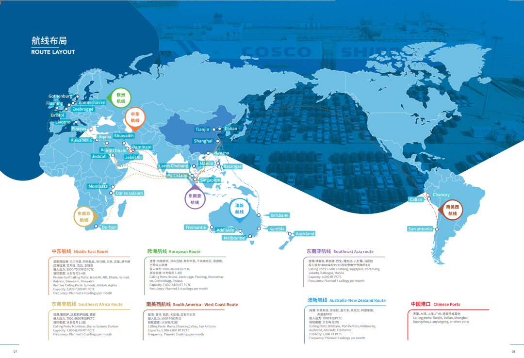 根據(jù)客戶需求,中遠(yuǎn)海運(yùn)協(xié)同船隊與港口優(yōu)化航線設(shè)置和運(yùn)力配置,靈活調(diào)整全球航線布局,開通中東波斯灣、東南亞、歐洲、墨西哥、中南美洲、非洲等班輪航線,為客戶定制商品車運(yùn)輸整體解決方案,提供多船型、全程端到端物流服務(wù)。
